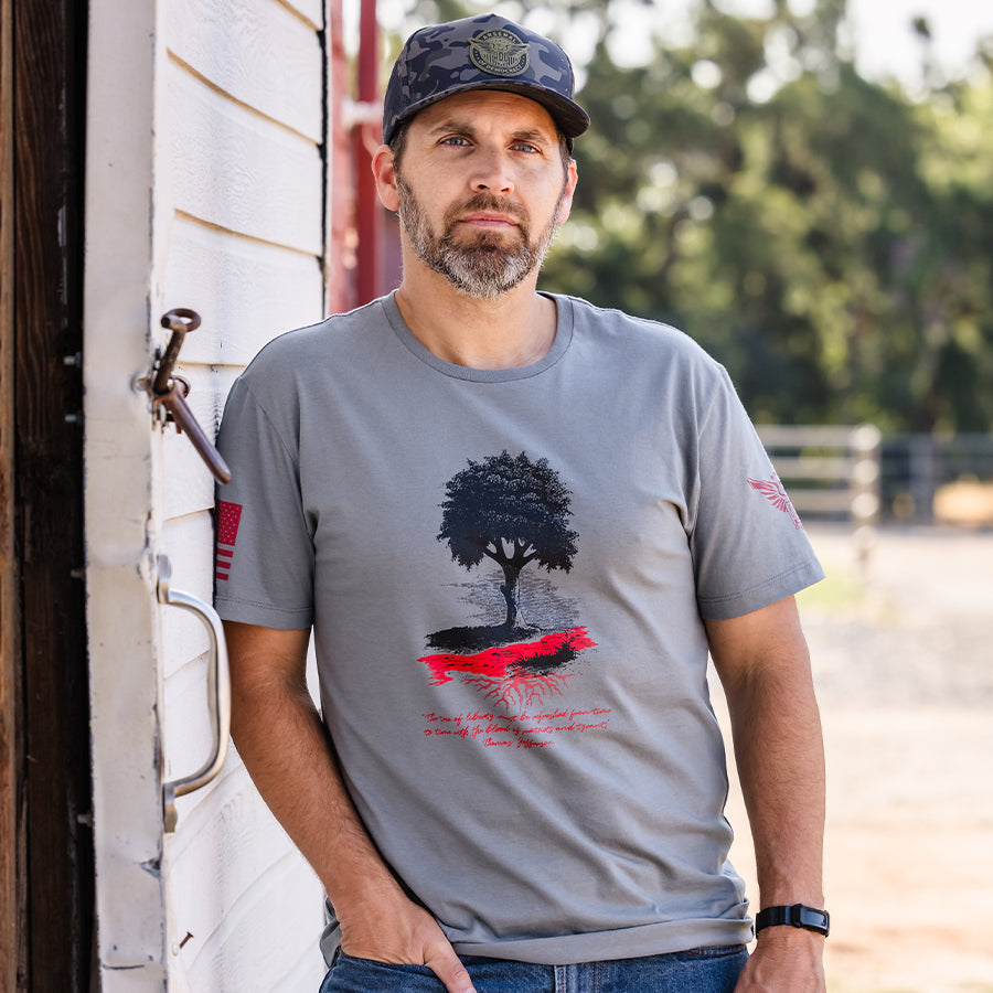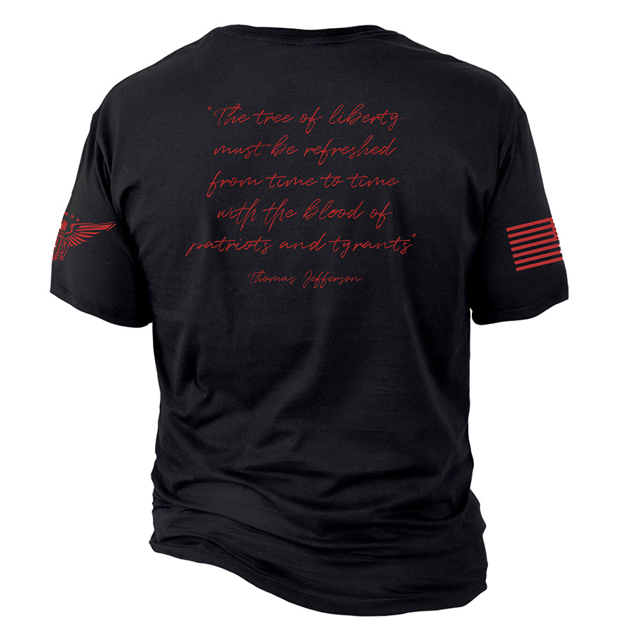 Jefferson understood that freedom isn't a one-time achievement—it requires constant vigilance and, sometimes, sacrifice. This shirt honors those who've watered the tree of liberty with their blood, from Lexington to Fallujah, and reminds us that eternal vigilance is the price of freedom.